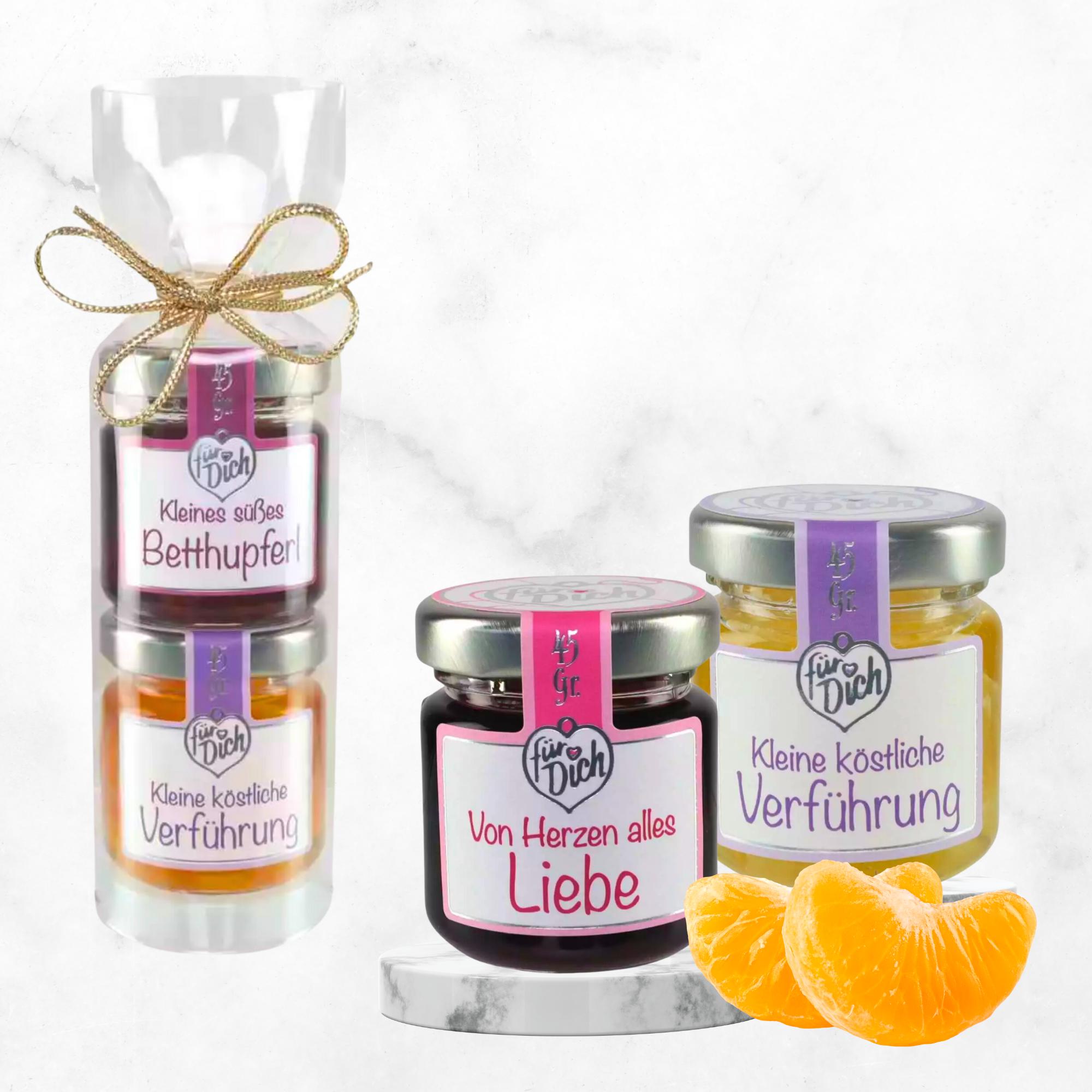 Entdecken Sie unser charmantes 2er Turm "Kleine Verführung - Mini", ein wahres Fest für Feinschmecker. Dieses elegante Set enthält zwei 45g-Gläser mit exquisiten Kreationen: Himbeer & Cognac sowie Mandarinen & Mandarinenlikör. Perfekt für Liebhaber von Früchten in Alkohol und Genießer feiner Aromen, bietet dieses Set ein unvergleichliches Geschmackserlebnis, das nach traditioneller Rezeptur hergestellt wird.