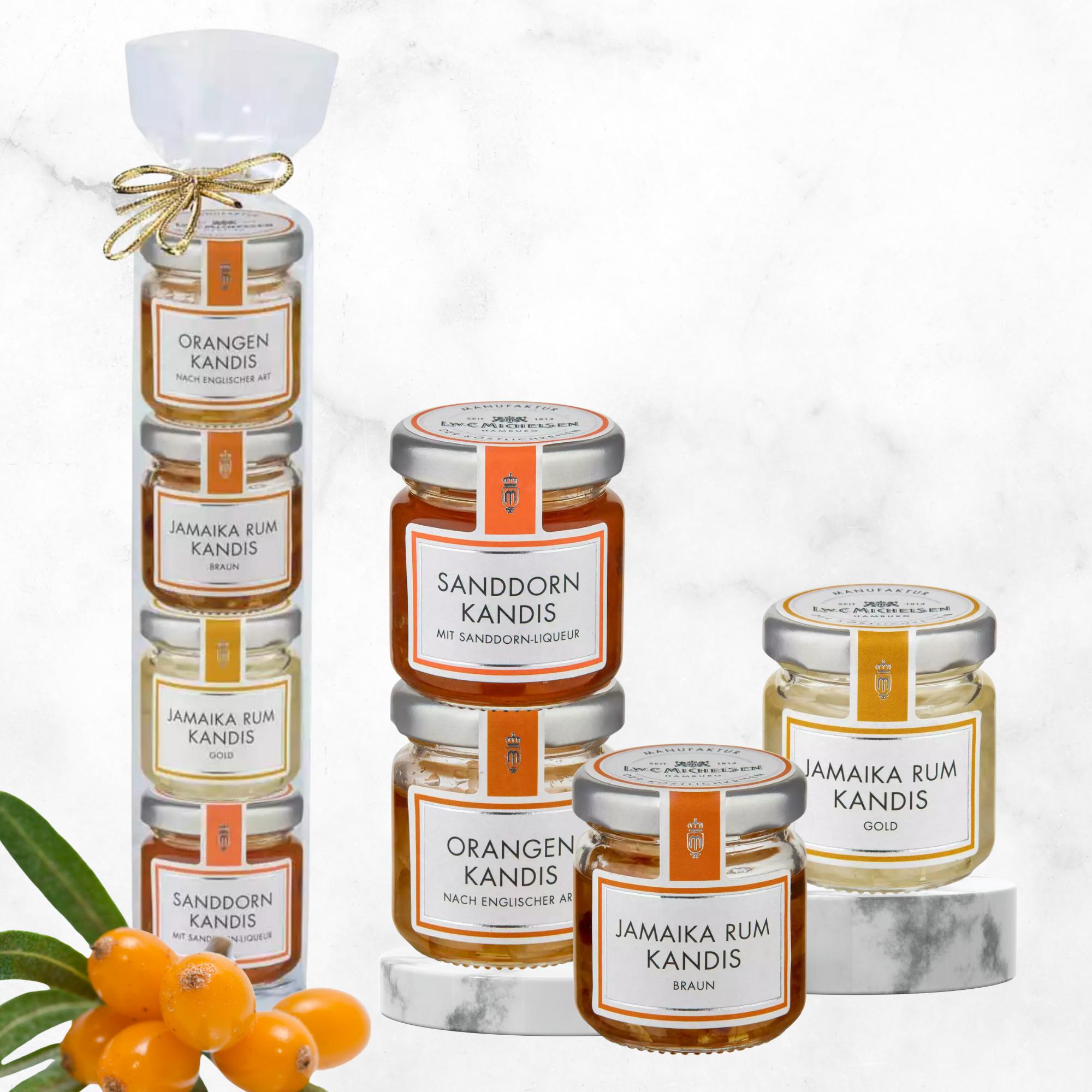 - Vier exquisite Kandis-Sorten: Sanddorn, Orange, Jamaika-Rum (hell & dunkel).