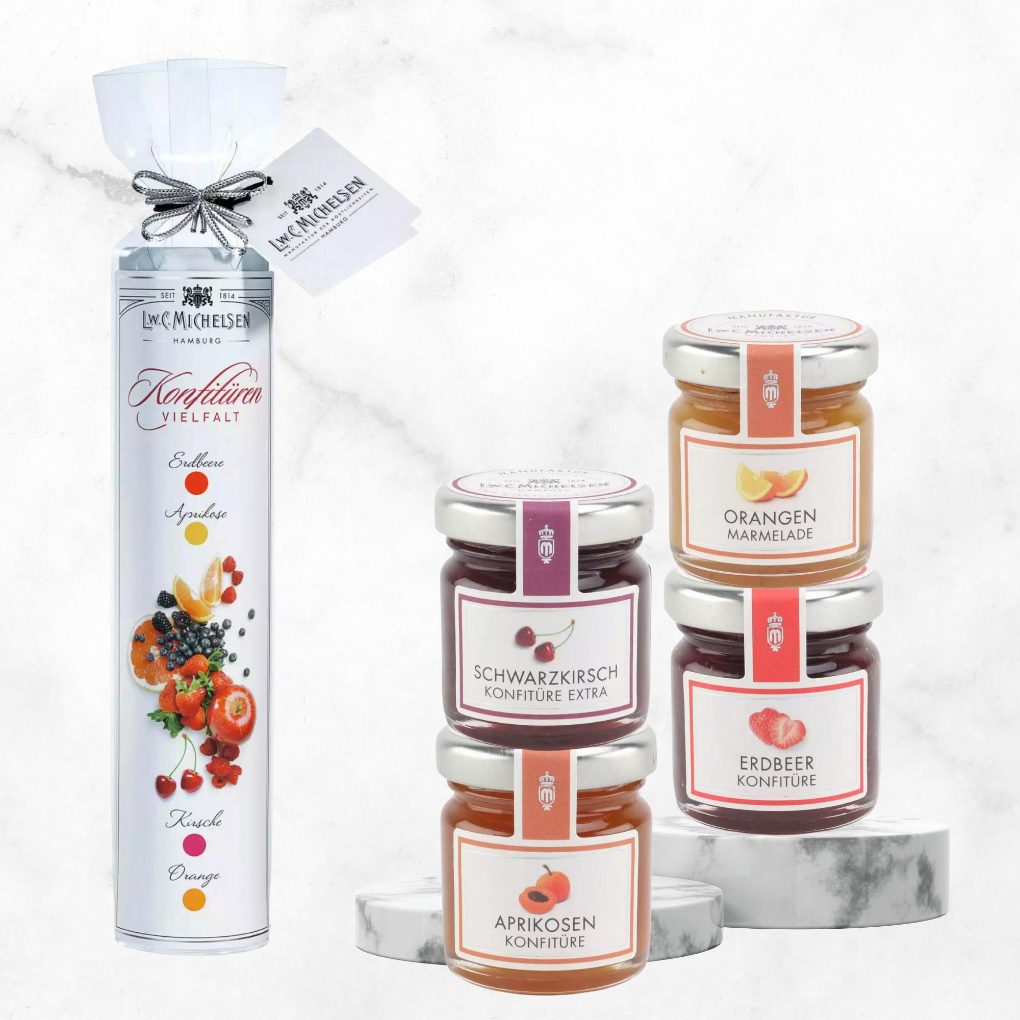4er Turm Konfitüren -Miniatur-: Vier feine Konfitüren im Miniatur-Turm – süßer Genuss für Feinschmecker