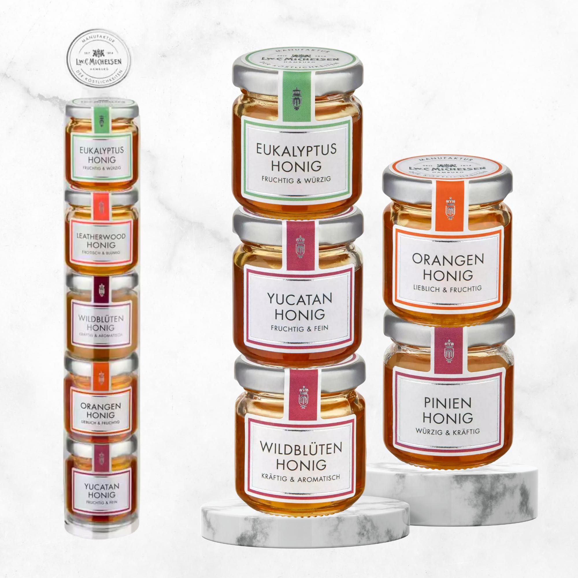 Entdecken Sie das exquisite Präsent-Türmchen von L.W.C. Michelsen – ein wahres Fest für Honigliebhaber und Feinschmecker. Dieses exklusive Set enthält fünf erlesene Honigsorten, jeweils in einem handlichen 50-Gramm-Glas.
