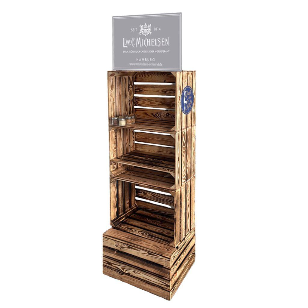 Die Kiste ist ausschließlich für die Präsentation ausgewählter Michelsen-Feinkost vorgesehen und bringt dabei die Werte unserer Manufaktur seit 1814 zum Ausdruck: Qualität, Nachhaltigkeit und Liebe zum Detail.