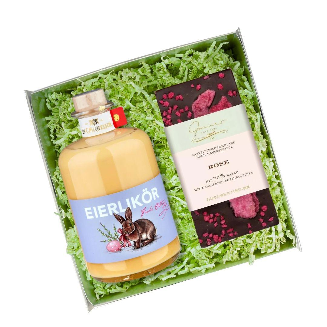Enthalten sind ein cremiger Eierlikör in der charmanten Apothekerflasche sowie eine handgeschöpfte Zartbitterschokolade mit 70 % Kakaoanteil, veredelt mit natürlichem Rosenöl und kandierten Rosenblüten.