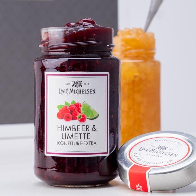 Unsere Himbeer & Limette Konfitüre -Extra- vereint die Frische saftiger Himbeeren mit der fein-säuerlichen Note der Limette zu einem besonders aromatischen Geschmackserlebnis.