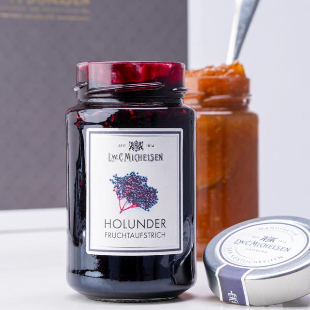 Unser Holunder Fruchtaufstrich ist ein wahres Geschmackserlebnis. Hergestellt aus sorgfältig ausgewählten Holunderbeeren, bietet er ein intensives Aroma, das jeden Bissen zu einem Genuss macht. Seit 1814 perfektionieren wir unser Rezept, um Ihnen diese besondere Delikatesse zu bieten.