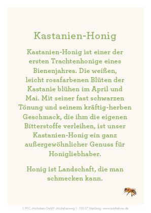 - Bernsteinfarbene bis dunkelbraune Honig-Spezialität mit kräftig-herbem Geschmack, gewonnen aus dem Nektar der Edelkastanie.