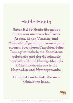 - Der Heide-Honig von L.W.C. Michelsen wird aus dem Nektar von Heidekräutern gewonnen und bietet ein intensives Aroma, das an Waldbeeren und Karamell erinnert.
