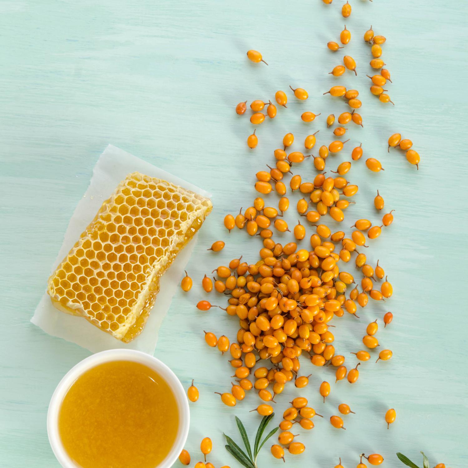 97% Honig, 3% natürliches Sanddornfruchtsaft-Konzentrat. |