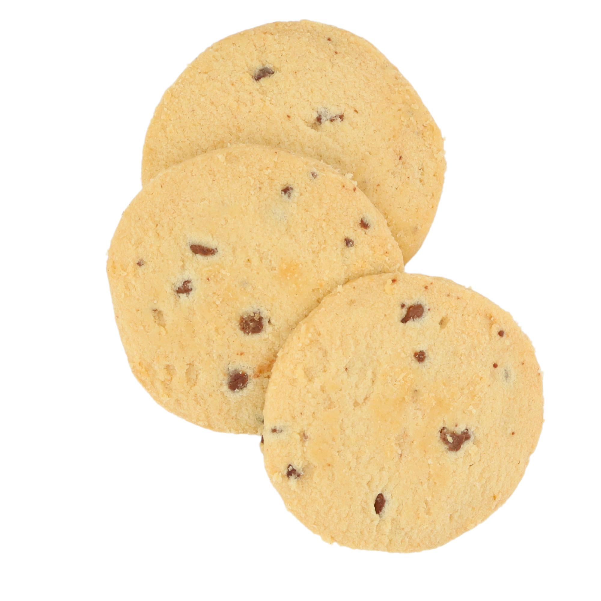 WEIZENmehl (mit Calciumcarbonat, Eisen, Niacin, Thiamin), Butter (MILCH, Salz), dunkle Schokoladen-Chips (7%) (Kakaomasse, Zucker, Emulgator (SOJAlecithin), natürliches Vanilleextrakt), Zucker, Maismehl. Kann Spuren von Nüssen und Sesam enthalten. |