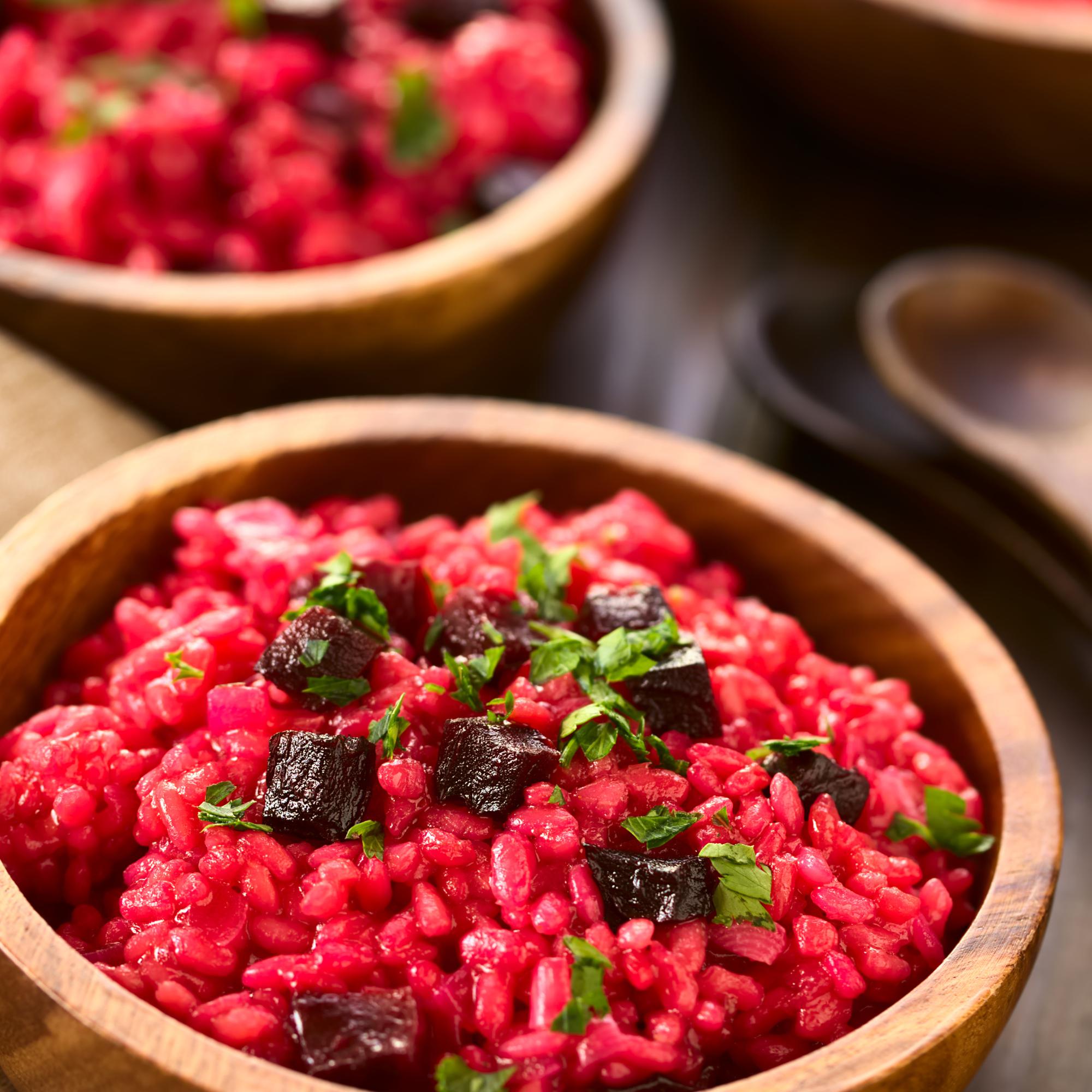 - Die leuchtend pinke Farbe und besondere Note verdankt das Risotto 4% roter Beete und 1% Zwiebeln.
